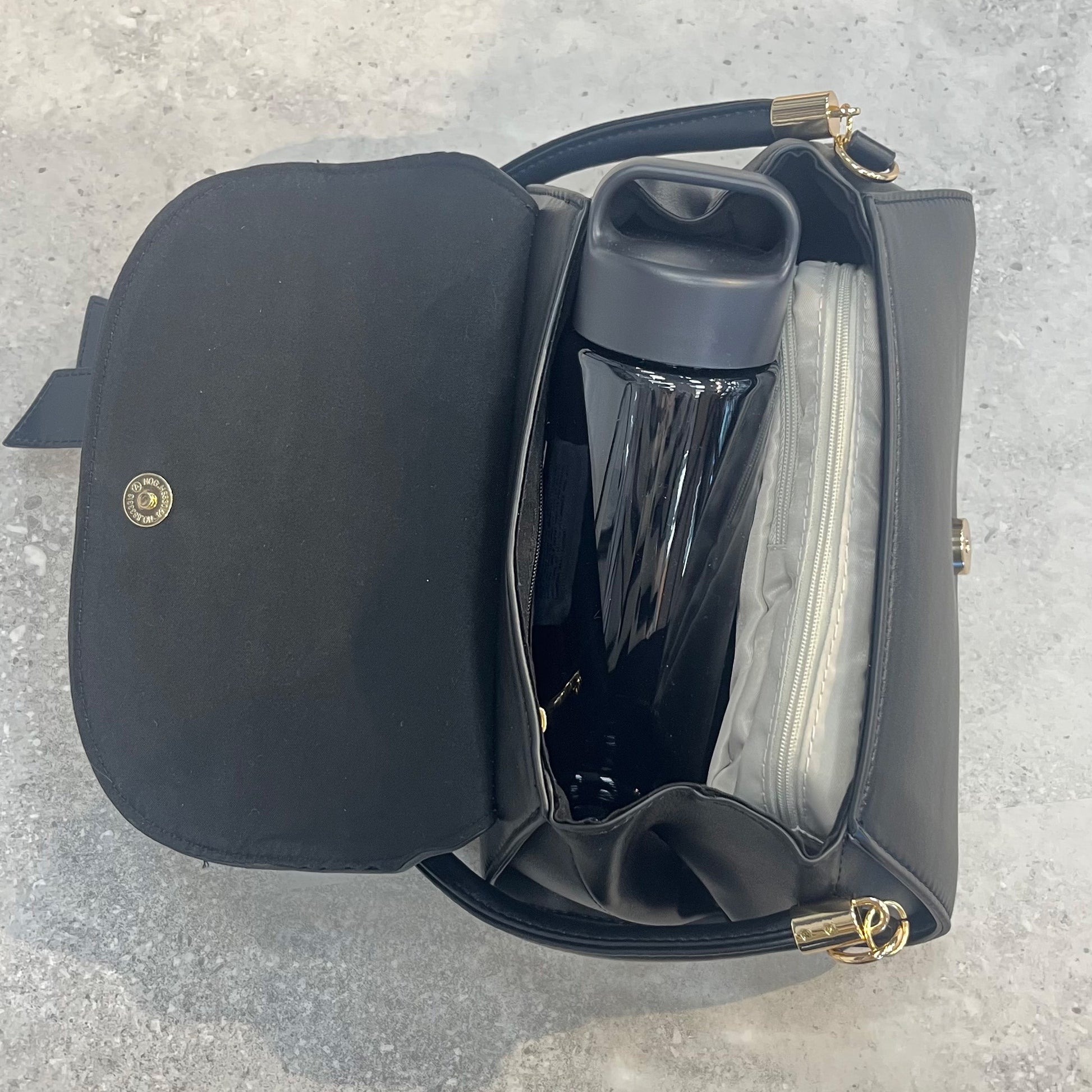 フェミニンな印象で華奢見えですが、フラップを開けるとガバっと口が開くので物の出し入れがしやすく、とても使いやすいデザイン。